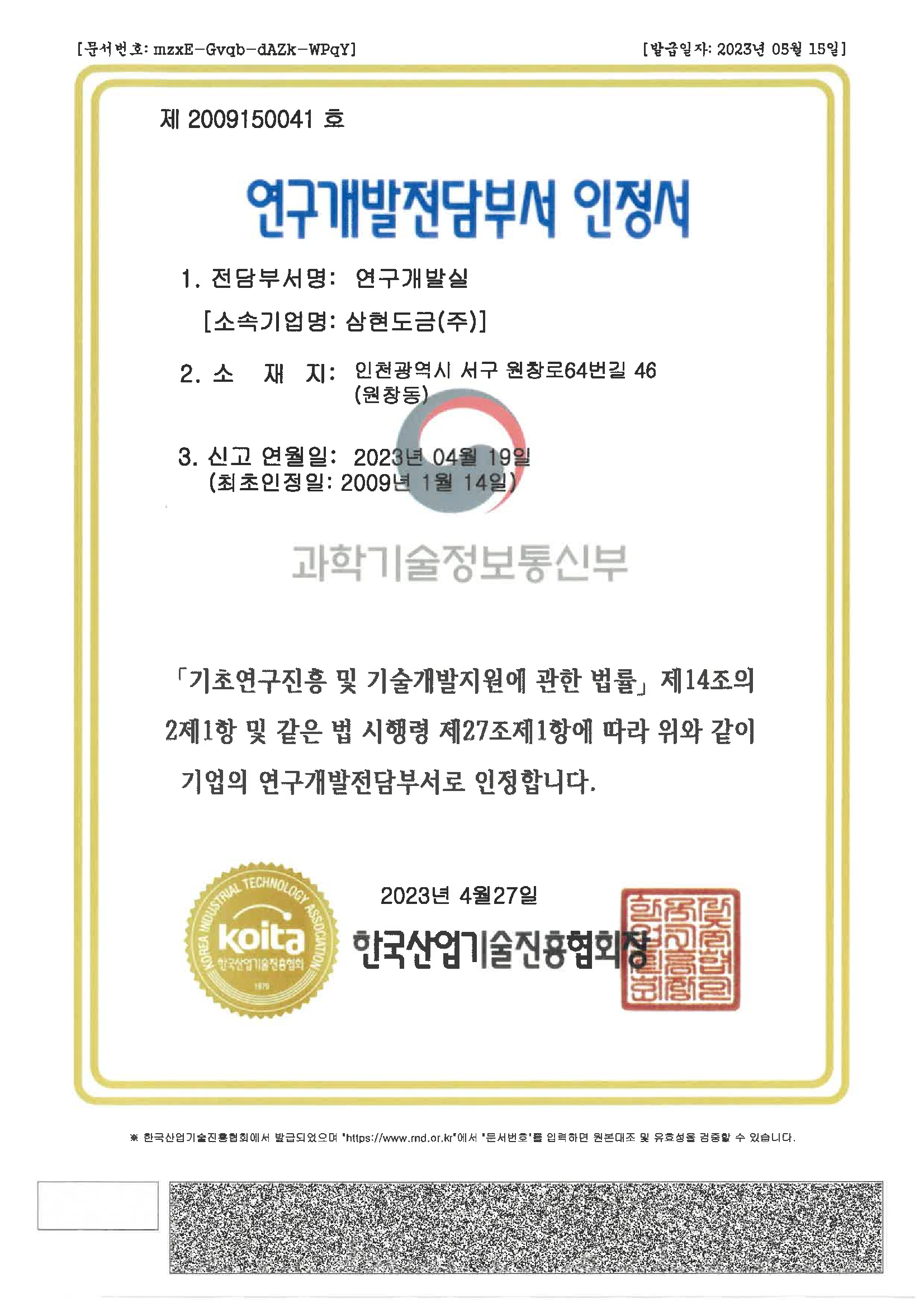 저희 삼현도금은 고객만족과 환경 보전을 위해 최선을 다하고 고유의 기술과 지속적인 연구개발을 통하여 신회받고 더불어 함께 발전하는 진취적인 회사, 사원모두가 혁신적이고 창조적인 도전의식을 갖고 이를 긍지로 여기는 열린 회사가 되겠습니다.
